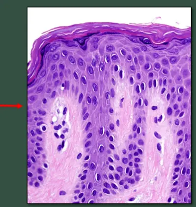 - Has a “spiny” appearance due to desmosomal junctions which hold the keratinocytes together.