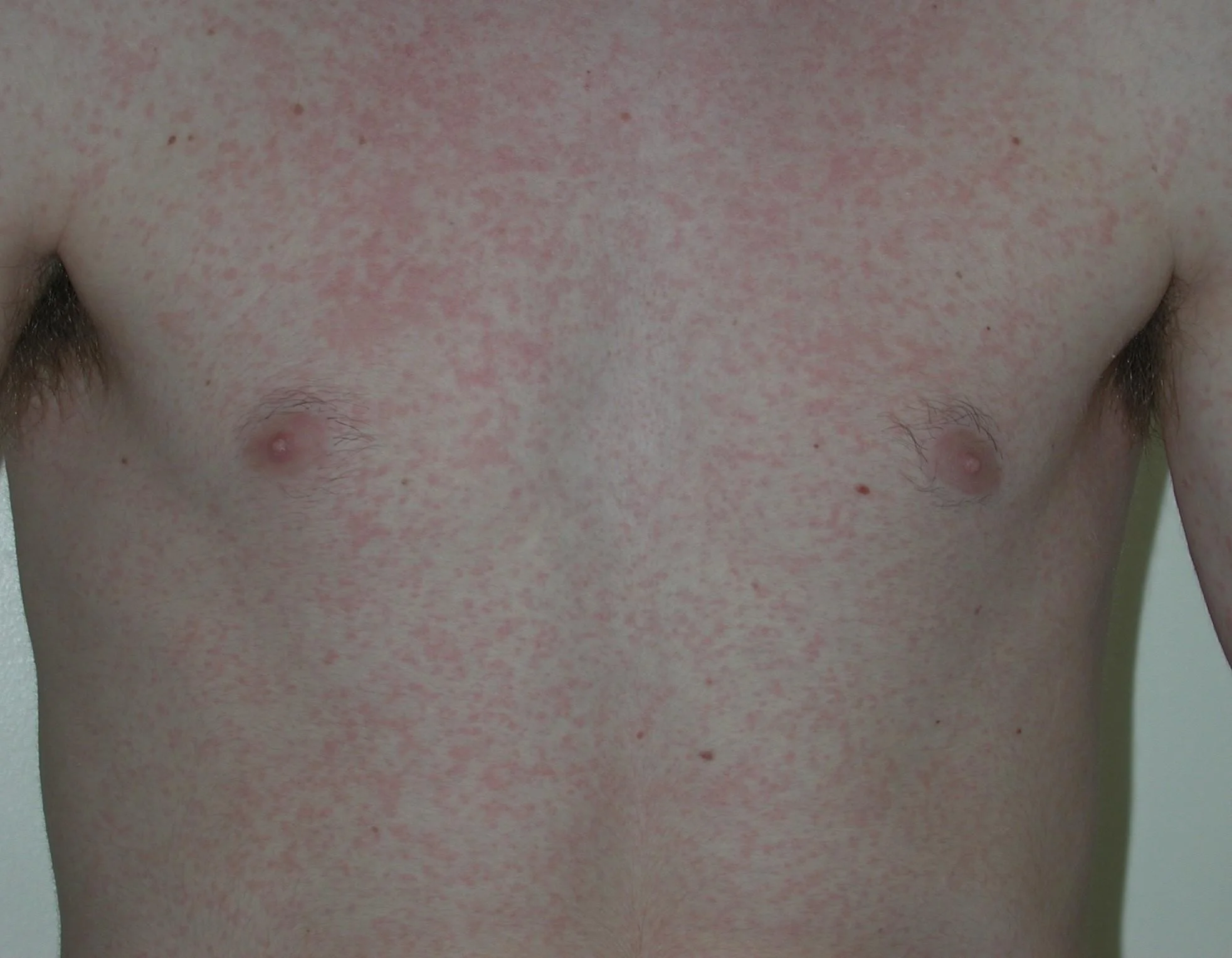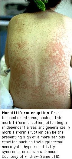 Drug-induced exanthems, such as this morbilliform eruption, often begin in dependent areas and generalize. A morbilliform eruption can be the presenting sign of a more serious reaction such as toxic epidermal necrolysis, hypersensitivity syndrome, or serum sickness.
