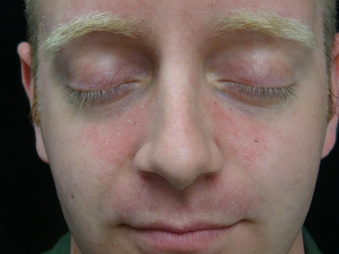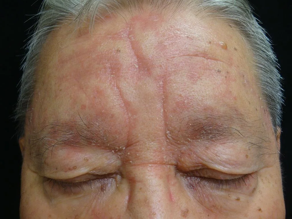 - HPI: Mr. L is a 56-year-old man with several years of redness and scaling on his forehead, eyebrows, and central face. He does not complain of itching but is embarrassed by his appearance. It has not gotten better with moisturizers. It does not worsen with heat, exercise, hot foods or drinks, or alcohol.