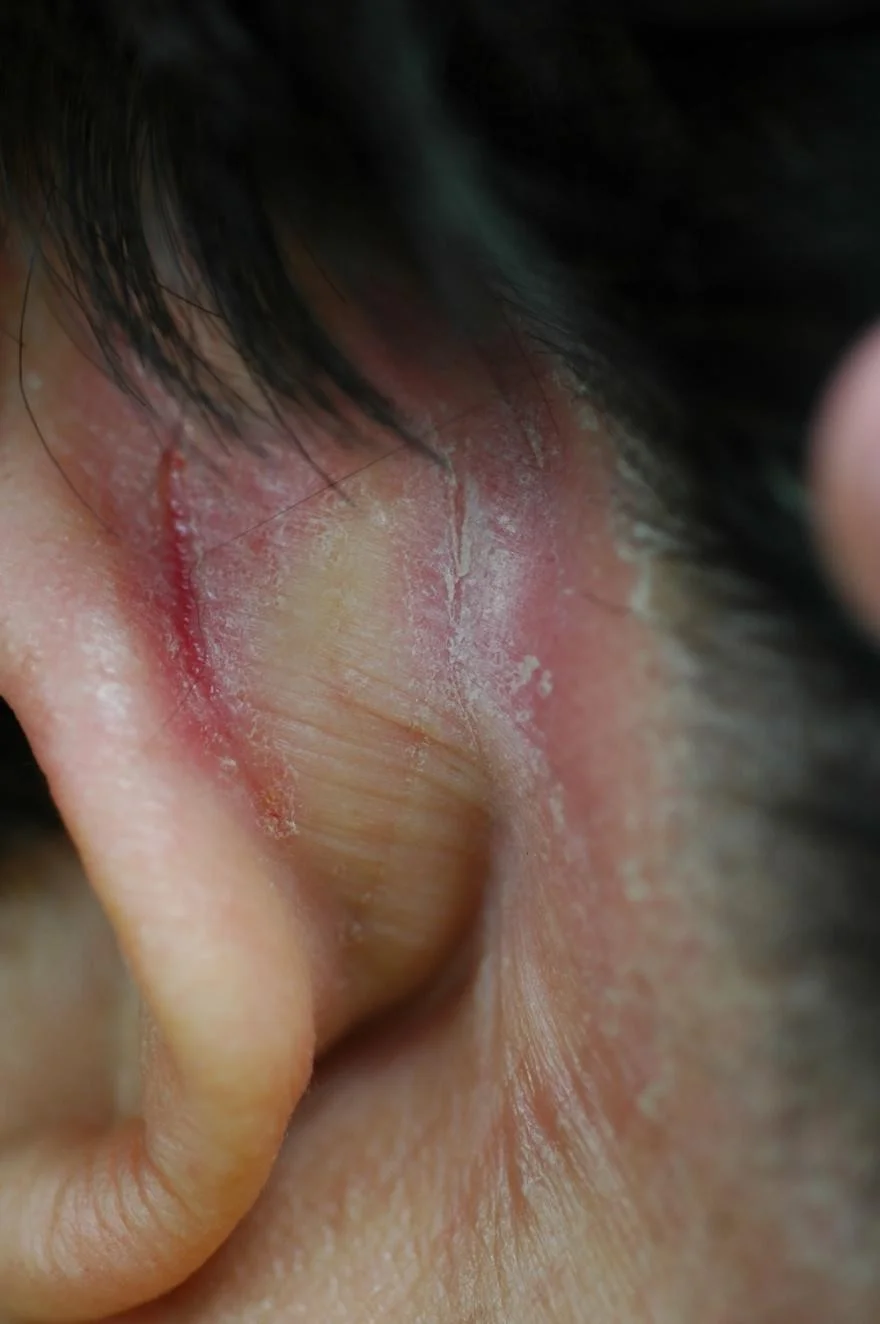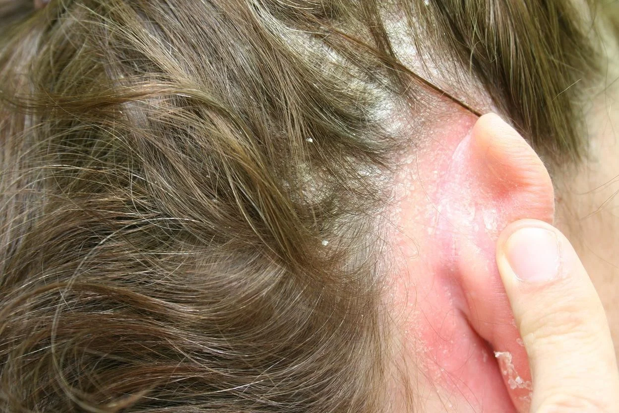 - It presents as erythematous scaling patches on the scalp, hairline, eyebrows, eyelids, central face and nasolabial folds, external auditory canals, or central chest