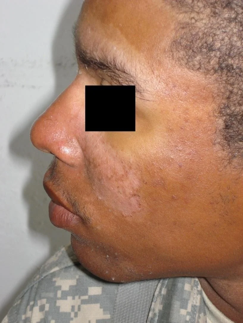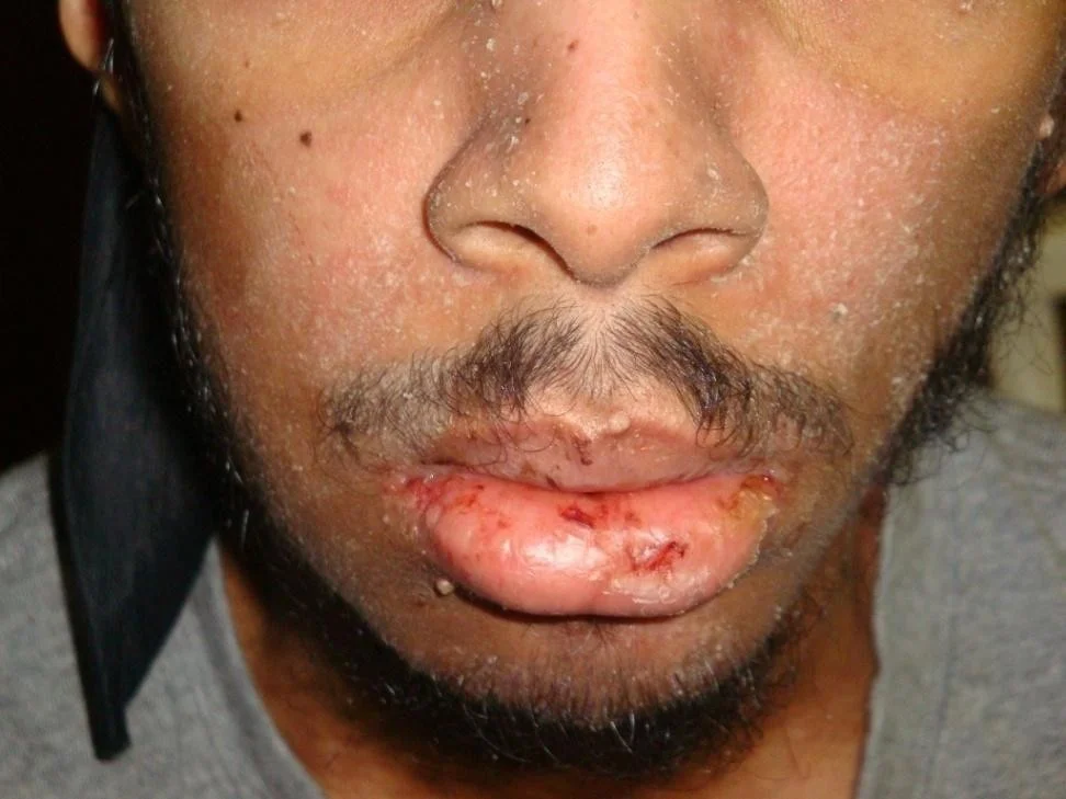 - How would you describe the rash on Mr. Lâs face? a. Erythematous macules b. Papules and pustules c. Thin scaling plaques d. Vesicles and crust