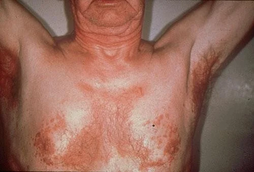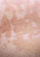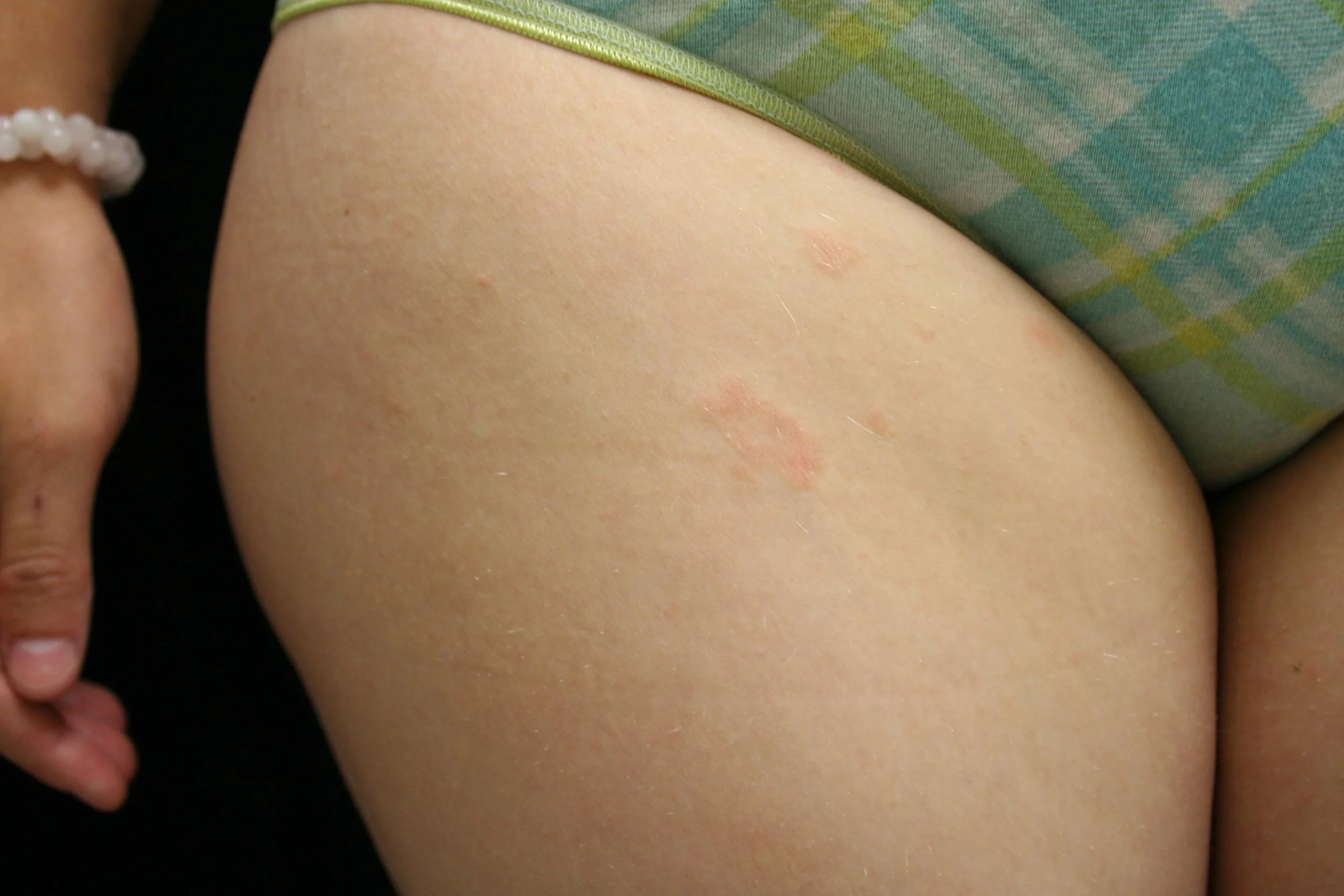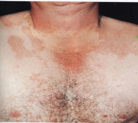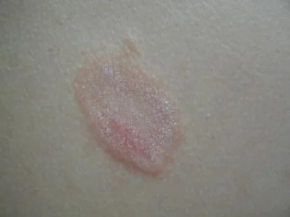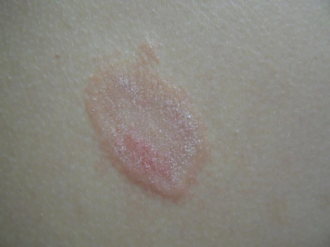 - Annular erythematous 2-10 cm patch anywhere on the body, with peripheral scaling and central clearing