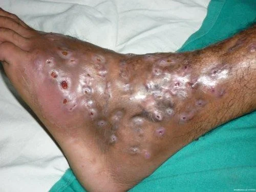 - The area becomes lumpy and distorted and developing multiple sinuses.