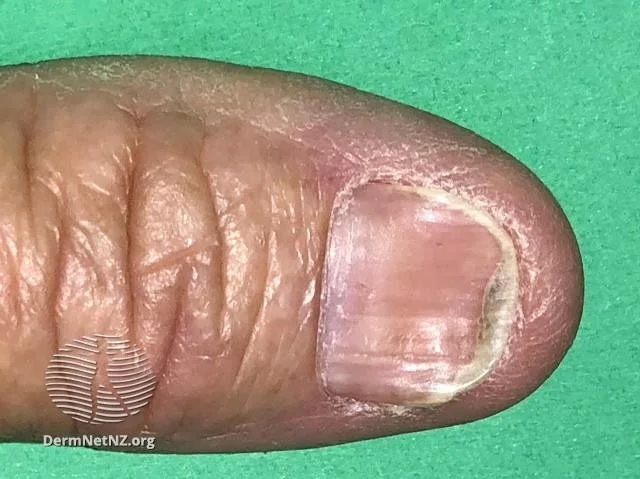 Dermatological changes might be due nail infection as onycholysis or a part of generalized dermatological diseases as psoriasis or lichen planus