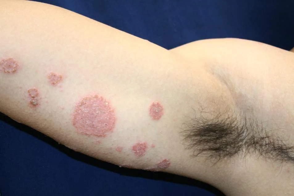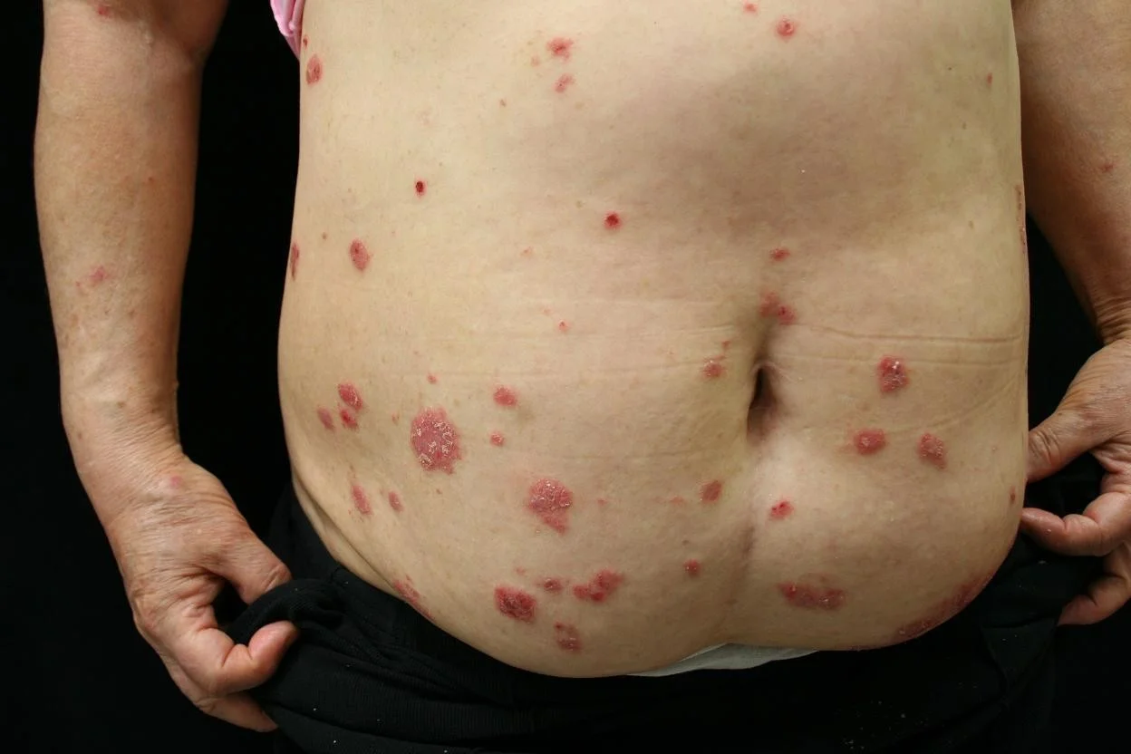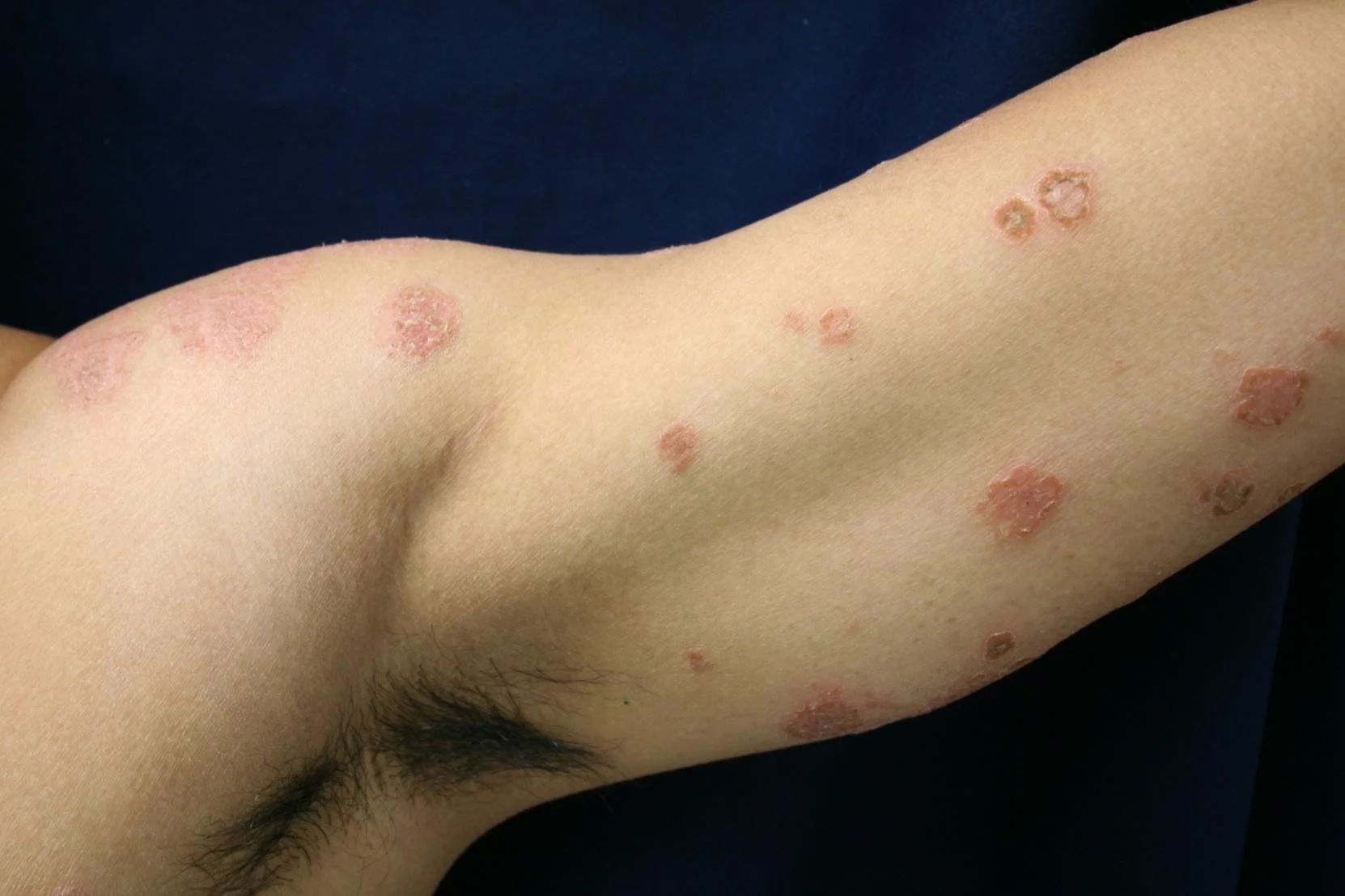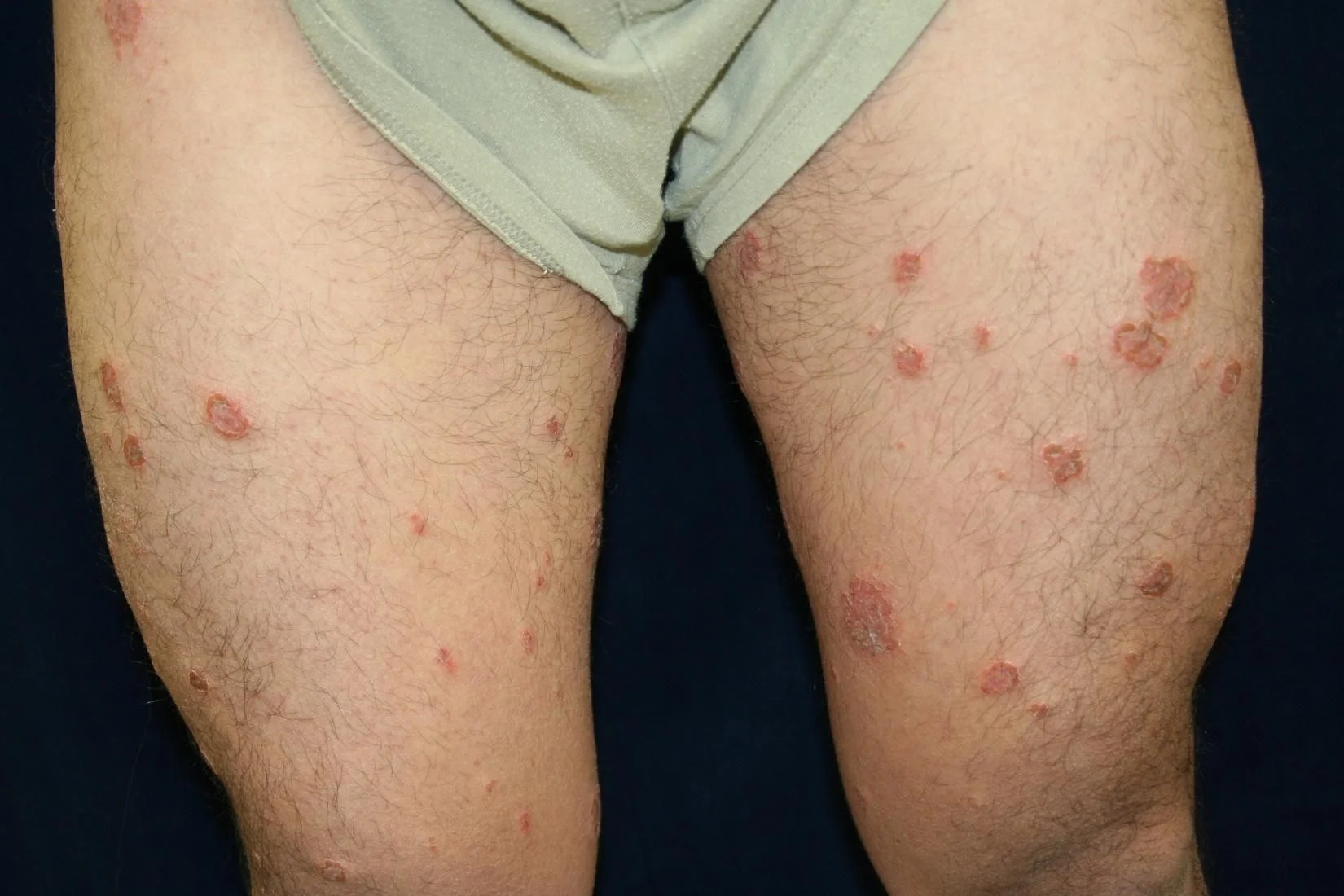 - The round eczematous plaques are on his arms, legs, and back.