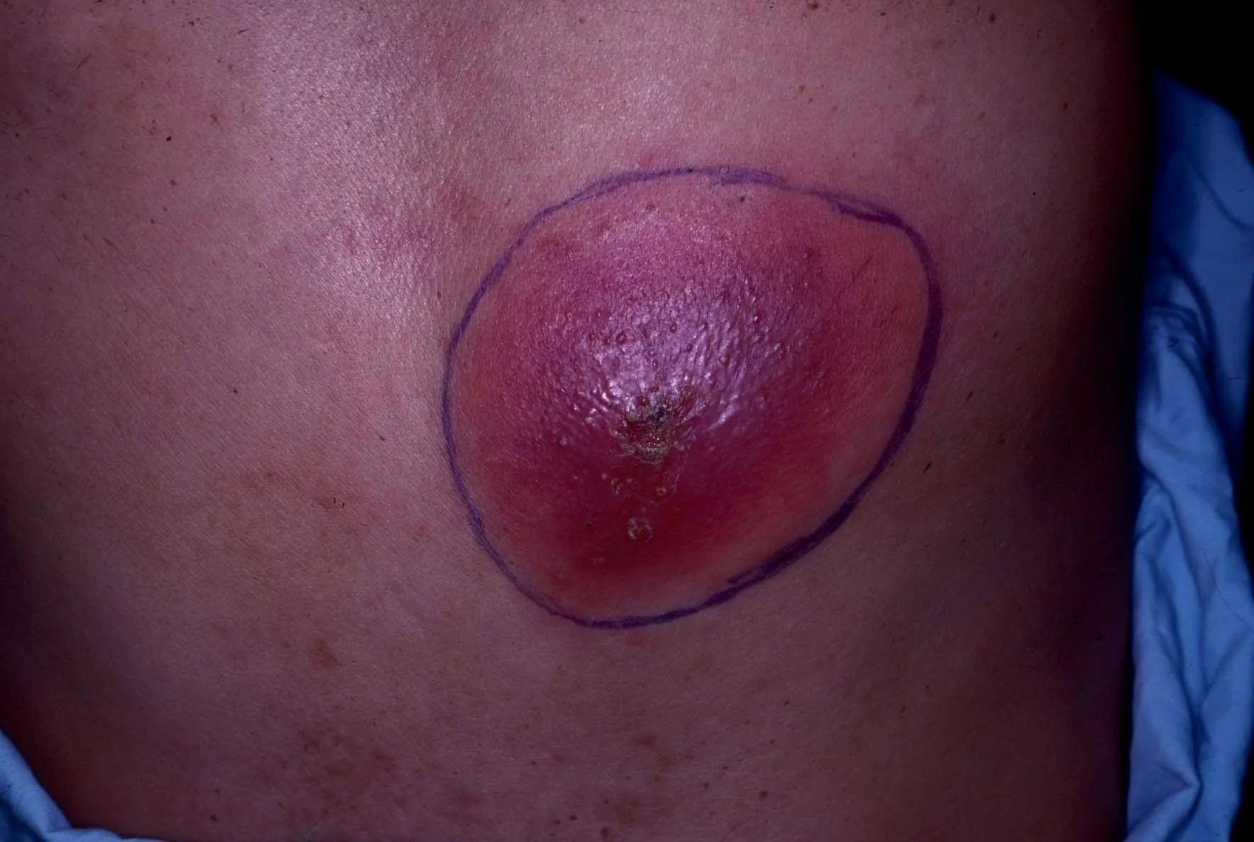 - Erythematous, warm, fluctuant nodule with several small pustules throughout the surface