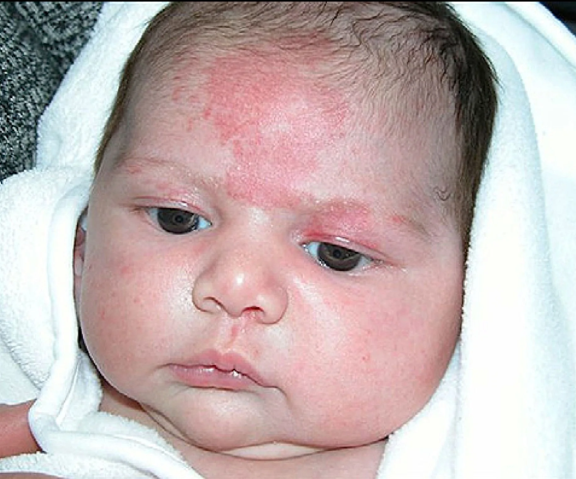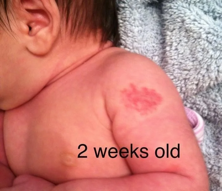 At birth, a premonitory mark may be present such as a bruise-like patch, area of vasoconstriction/pallor or telangiectasias