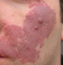 - Present as pink to dark red patches that are often unilateral with midline cutoff