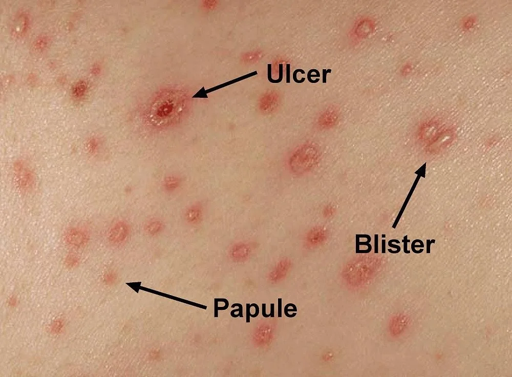 - Blisters appear first on the face and scalp, then on the trunk, and then on the arms and legs