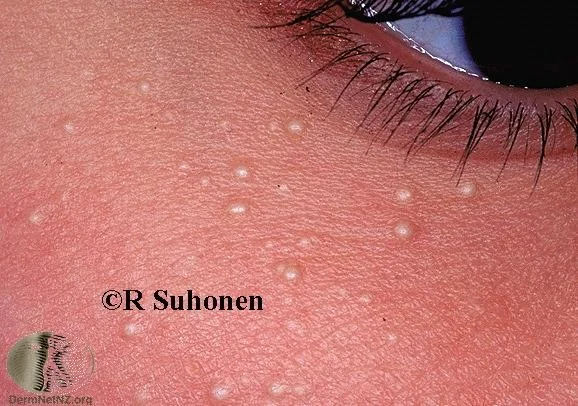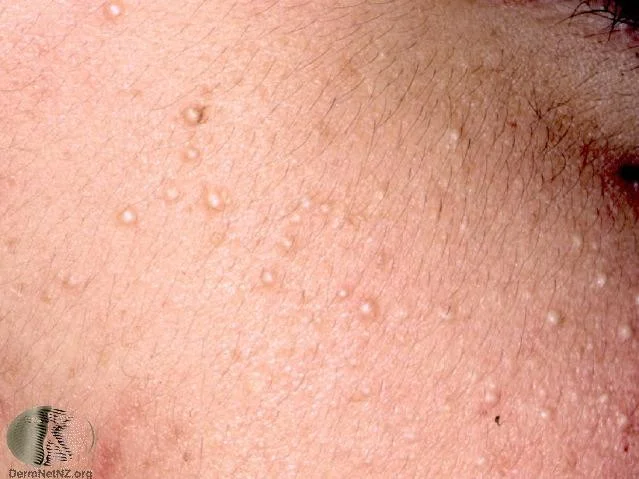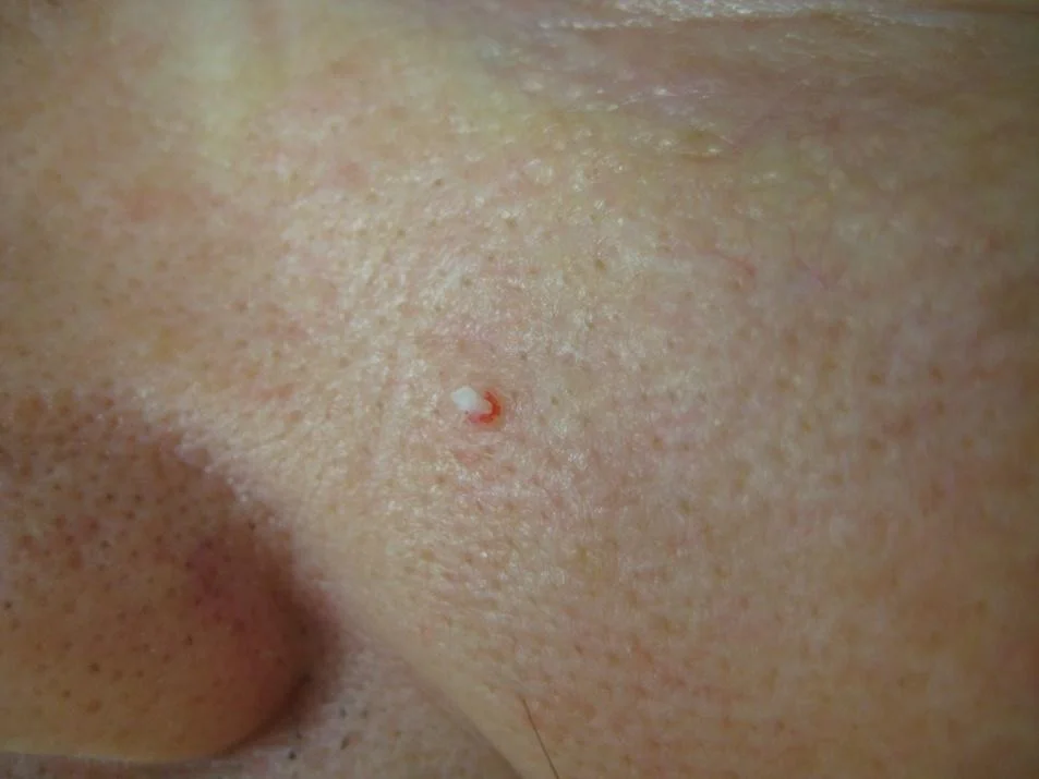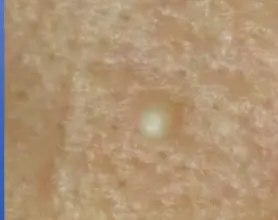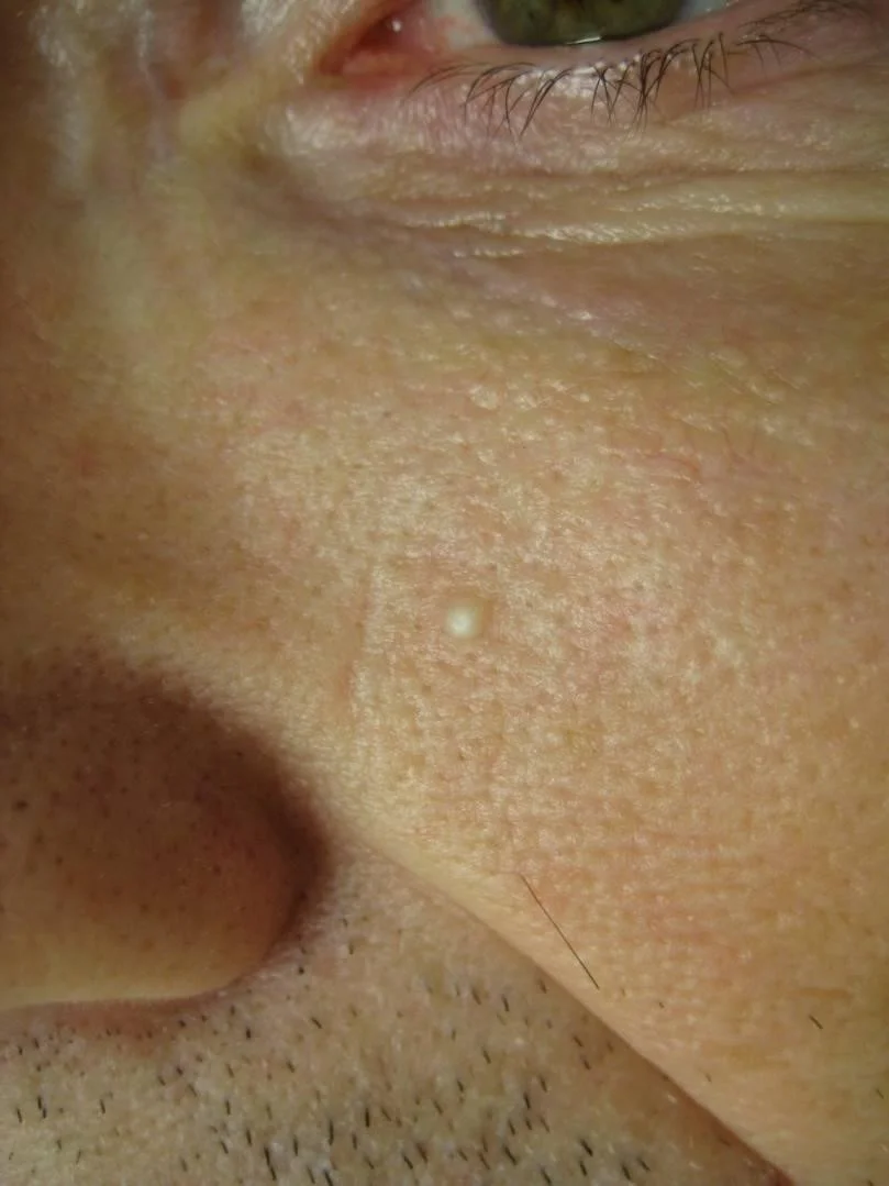 A 30-year-old male presents to your clinic and asks, “Doctor, this white bump on my cheek came up a few months ago and won’t go away. What is it?”