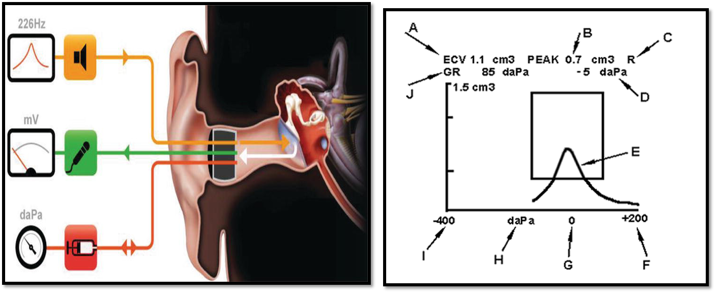 - Measures middle ear compliance with changing pressure in the External Auditory Canal (EAC).