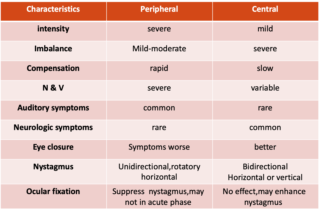 Central vs Peripheral Dizziness - Characteristics Comparison