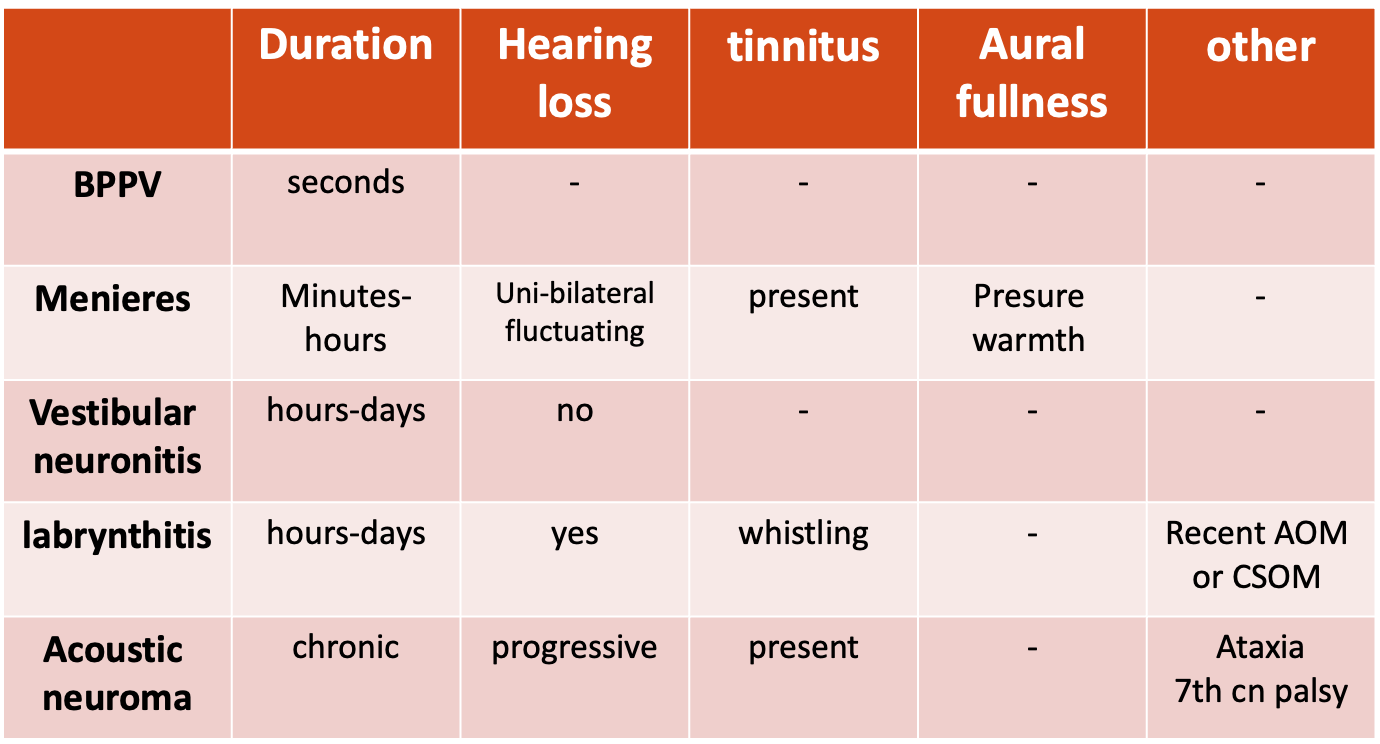 - History: Onset, Duration, Recurrence, Precipitating/Relieving factors, Ear symptoms, Nausea & vomiting, Headaches, Previous viral illness, Ear diseases, trauma, or surgery, Central symptoms, Cardiovascular risk factors, Endocrine system, Medications, Psychology, Premenstrual syndrome, Noise exposure, flying, diving, new eye glasses, Impact on patient, Family history.