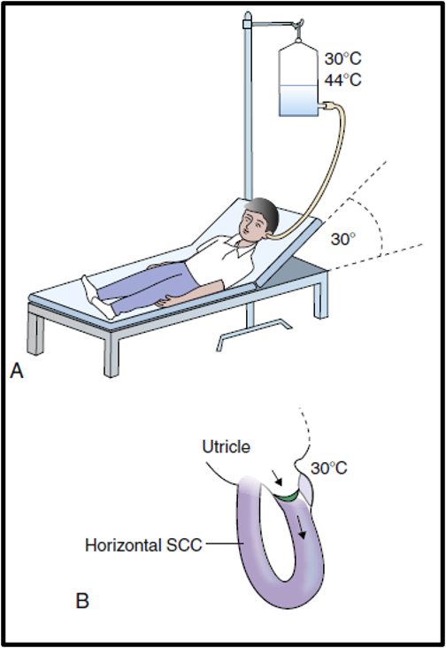 - in supine position, head is elevated (chin toward sternum) 30° to bring the horizontal canal into a vertical position, each ear is irrigated with cool and warm water (or air), nystagmus is recorded with eyes open and closed.