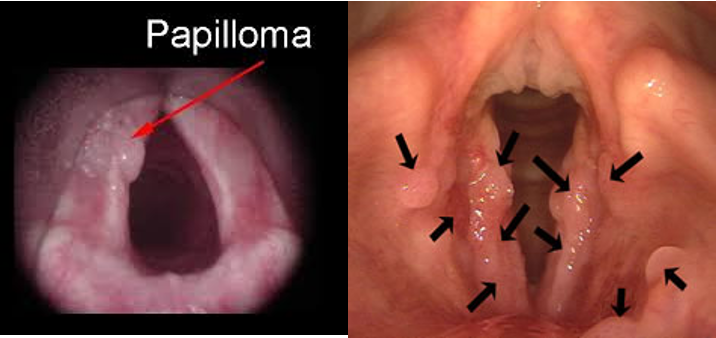 Children: Repeated removal by direct laryngoscopy, microsurgery, and cryosurgery. No tracheostomy. Tracheostomy is closed after removal each time (larynx grows normal). No recurrence in adults, recurs rapidly till puberty in children. May turn malignant in adults, does not turn malignant in children.