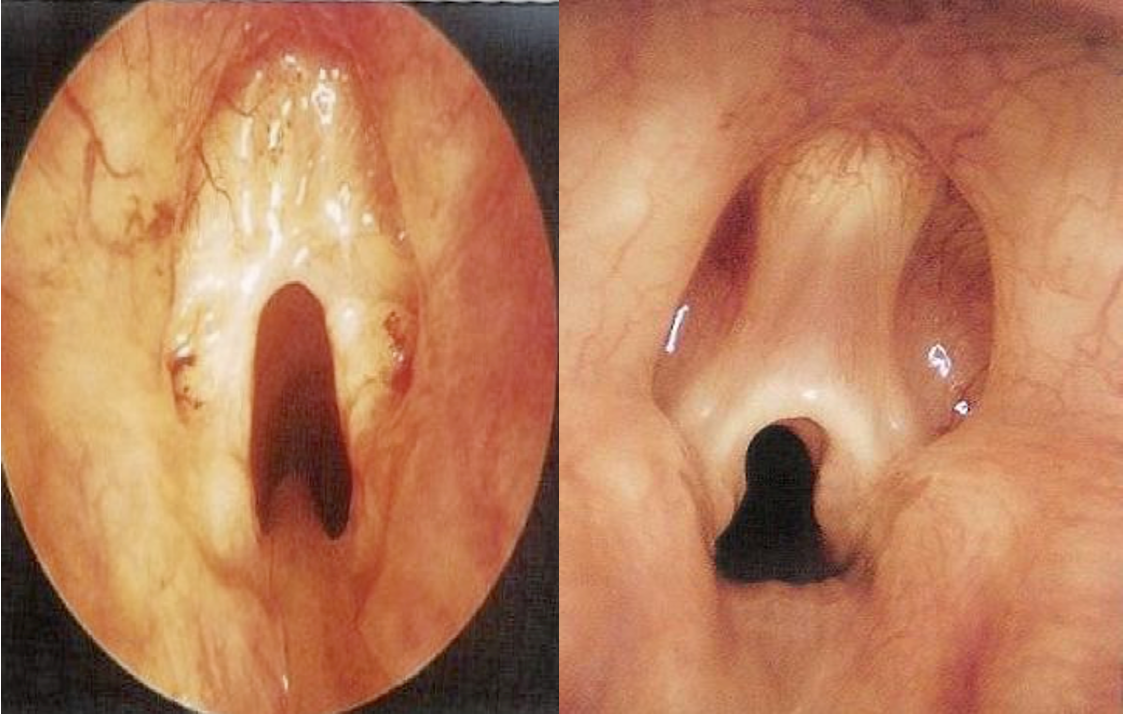 - Weak cry at birth, variable degrees of respiratory obstruction