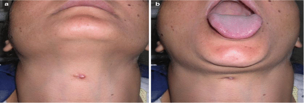 Rare tender, oval swelling, which lies transversely below the hyoid bone.