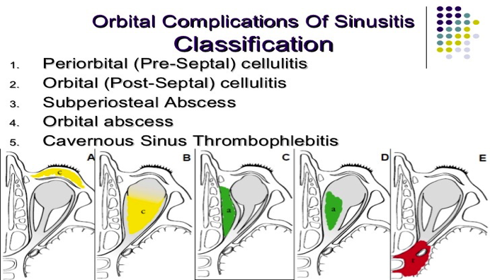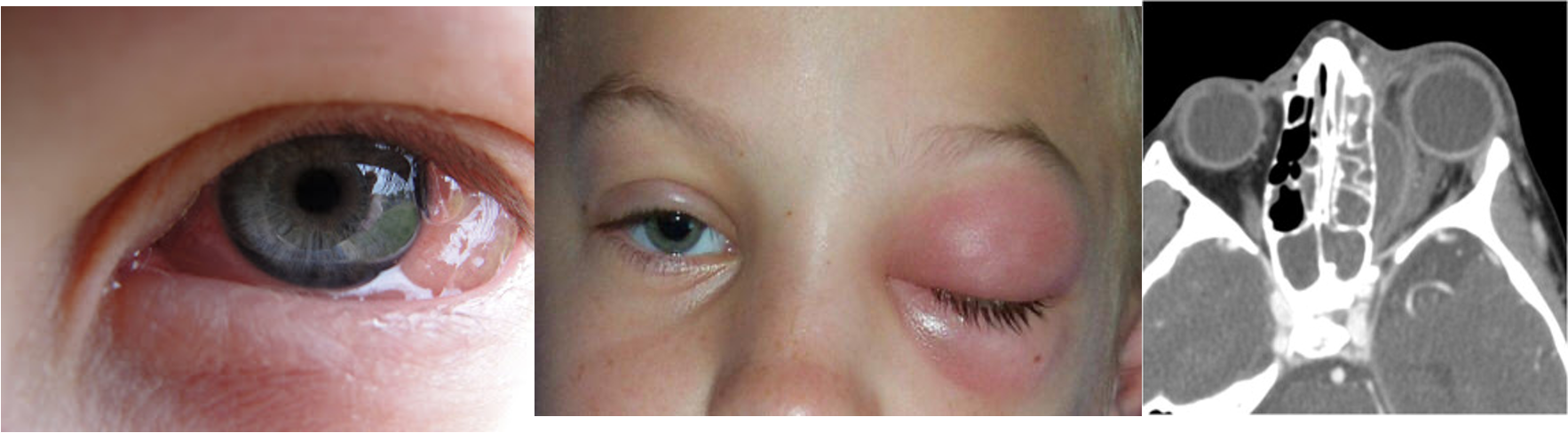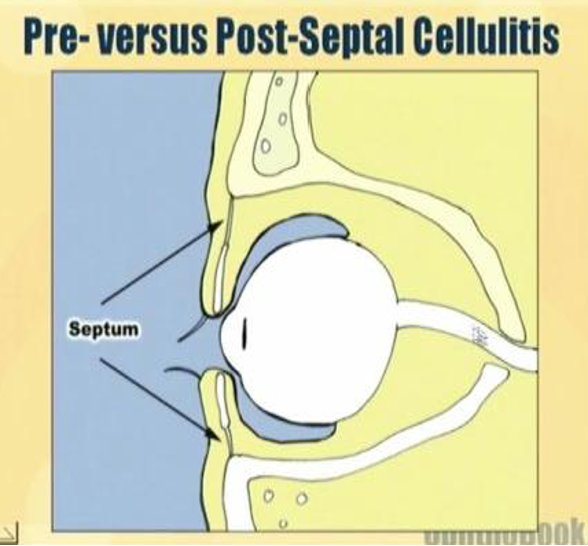 - Orbital cellulitis: Infection involving fat and muscles posterior to the orbital septum (postseptal).