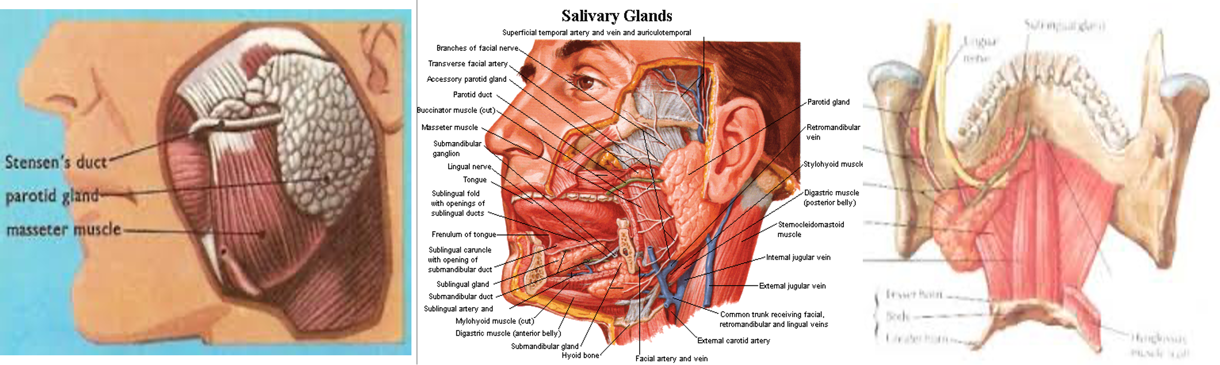 There are 3 pairs of main salivary glands: - Parotid Gland - Submandibular Gland - Sublingual Glands