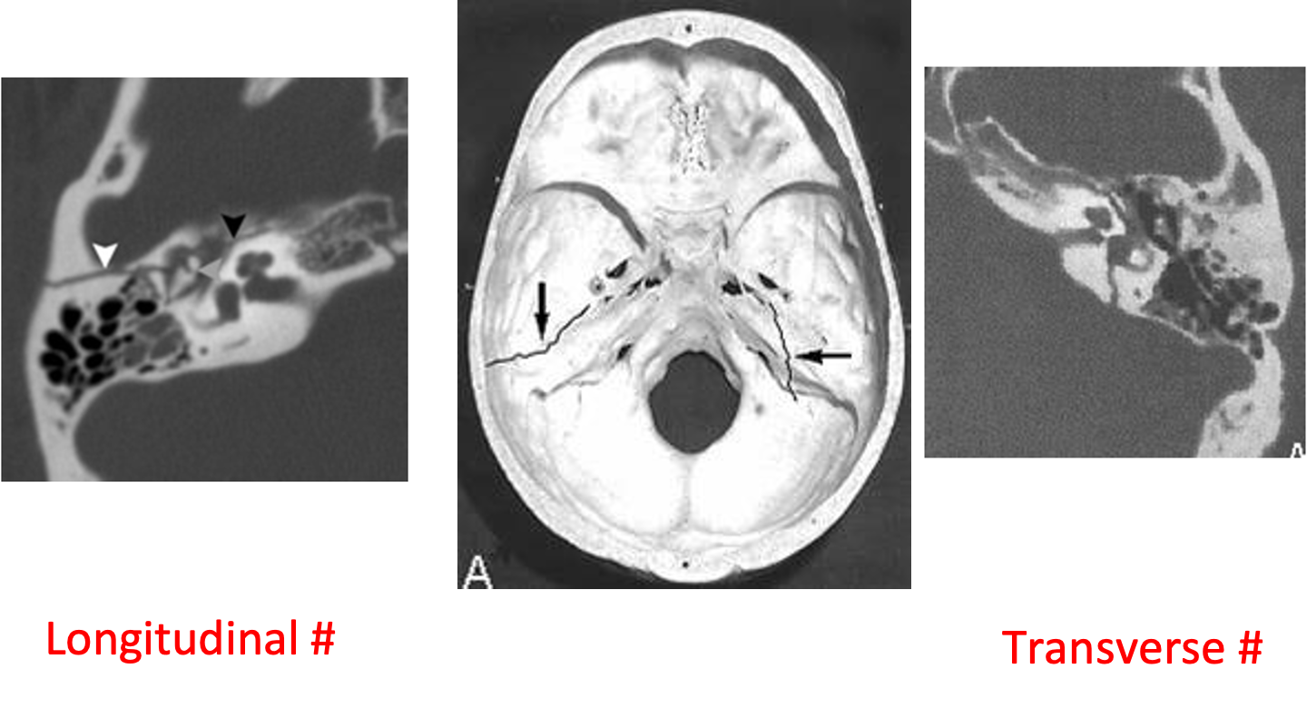 Transverse fracture - 20%: SNHL & vertigo (Labyrinthine injury) - Facial nerve paralysis is common