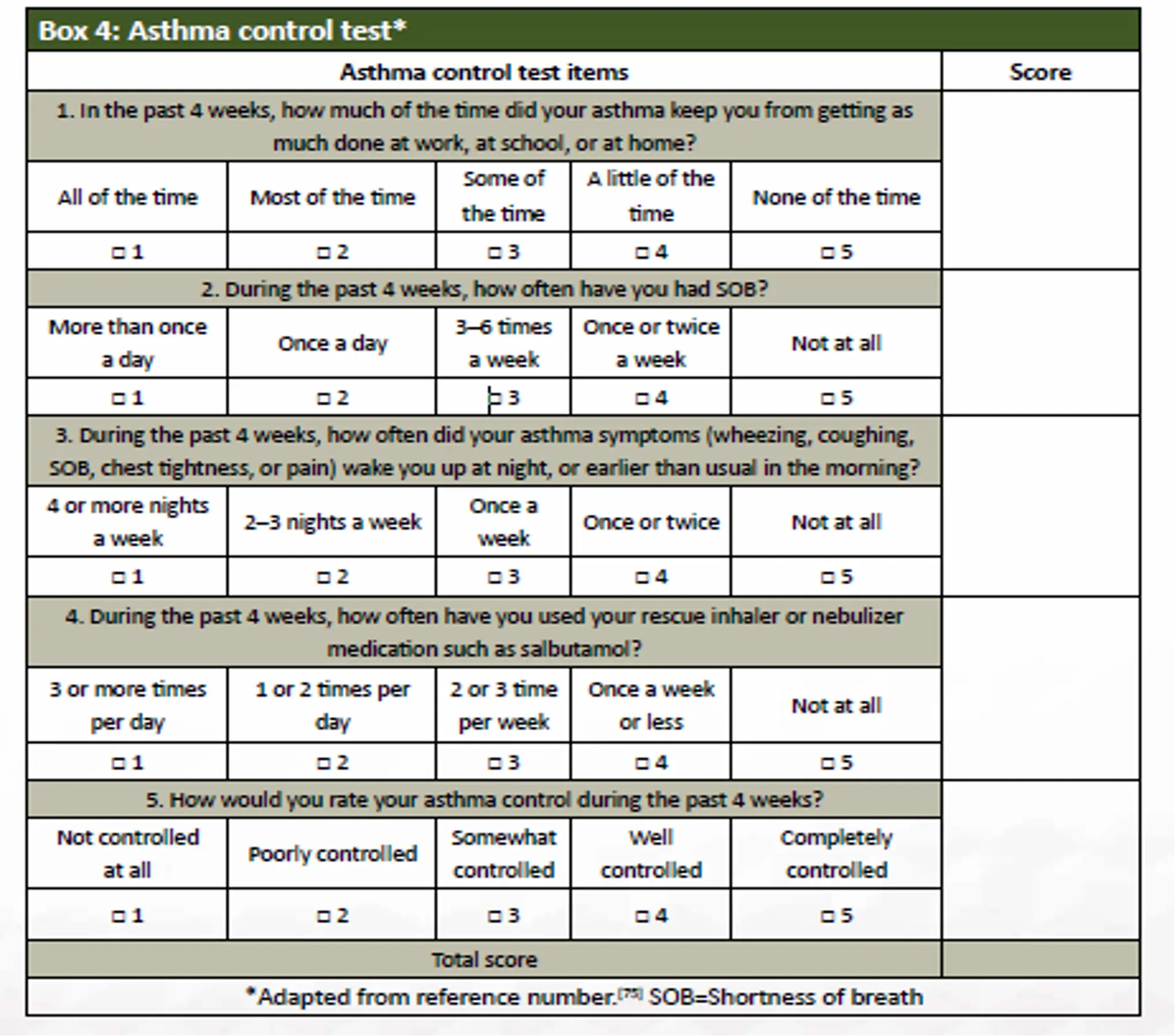 - For a total score ranging from 0 to 100. Higher scores would indicate better respiratory and asthma control.