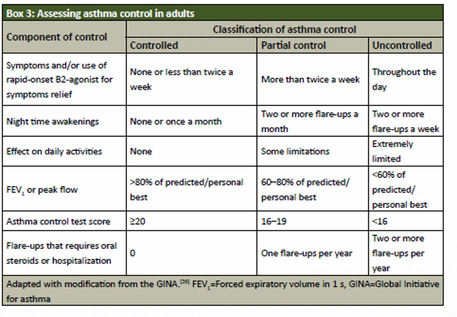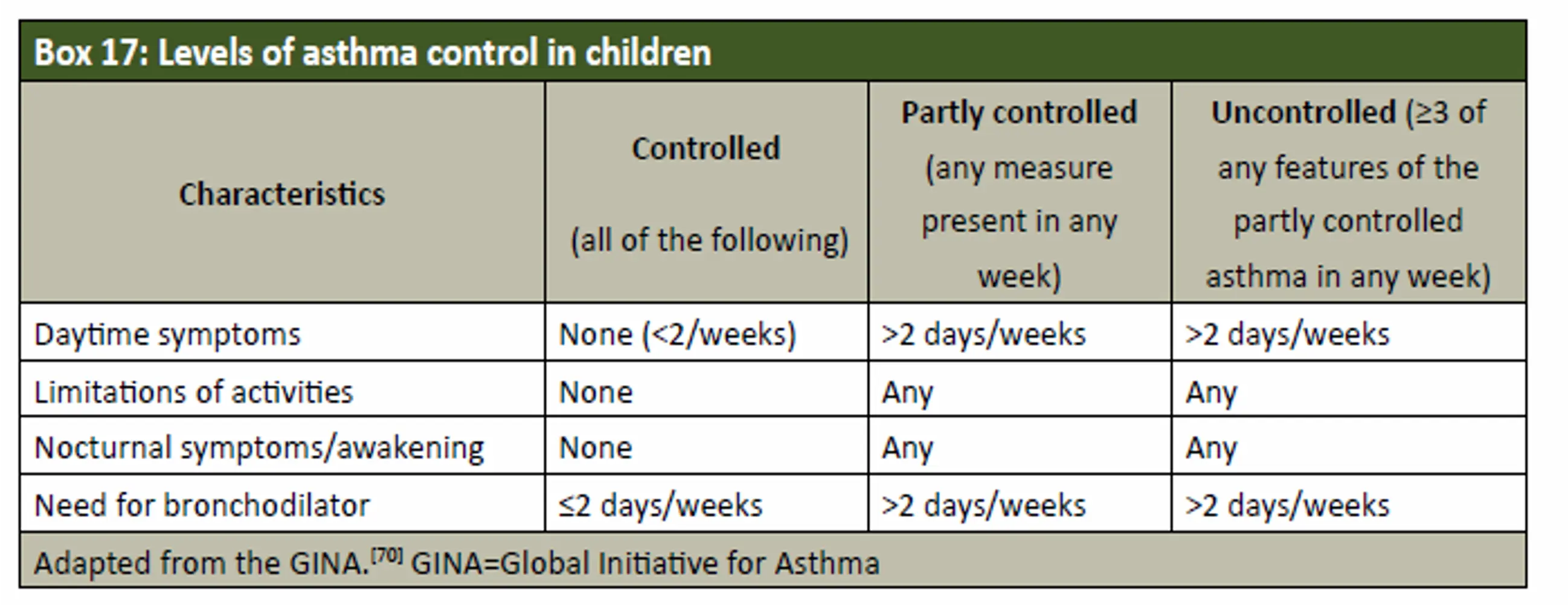 | Controlled (all of the following) | Partly Controlled (any measure present in any week) | Uncontrolled (≥3 of any features of the partly controlled asthma in any week) |