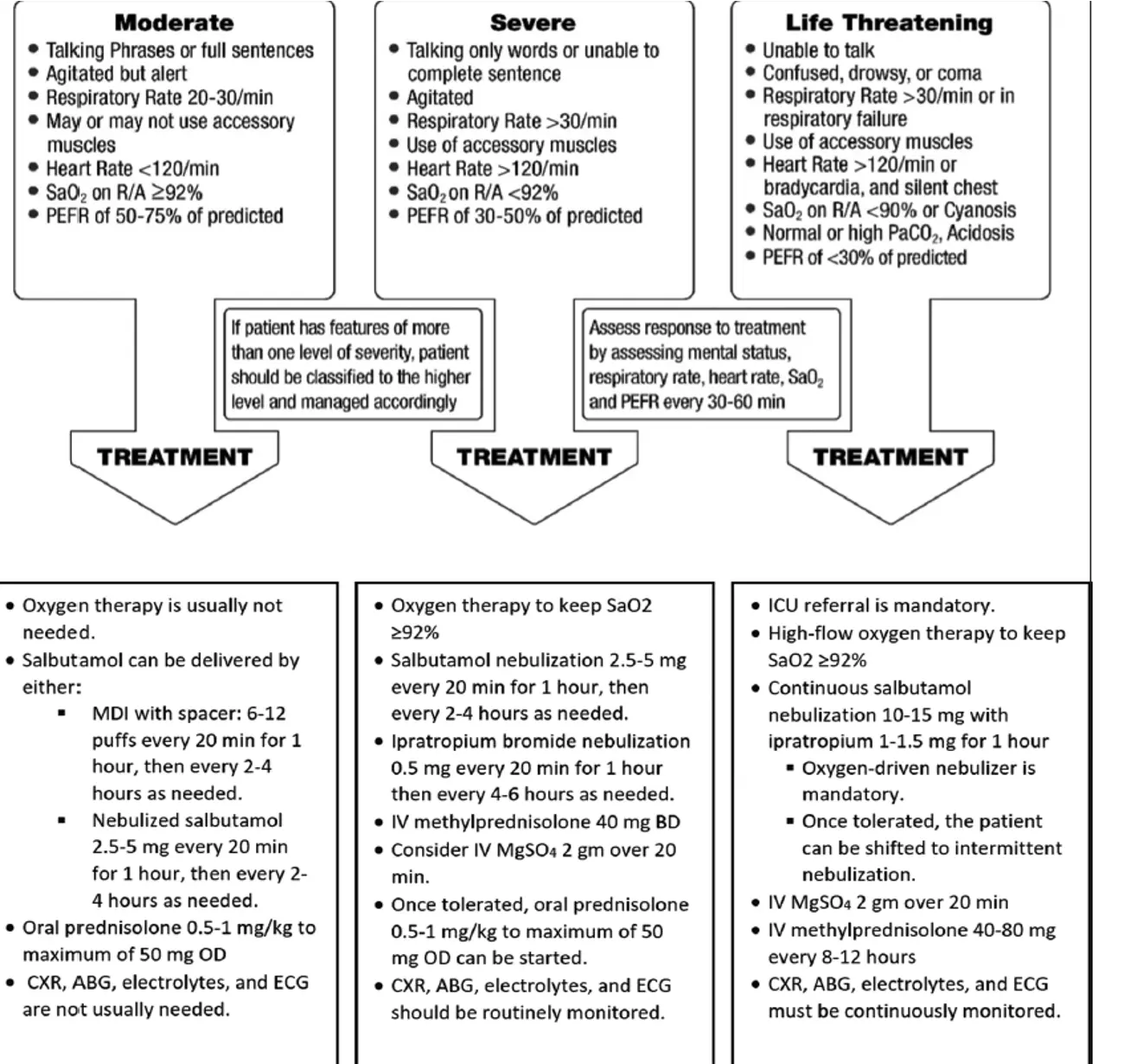 - For a child with early signs of moderate to severe asthma exacerbation at presentation, a short course oral prednisolone is recommended to be added to regular low-dose ICS/LABA.