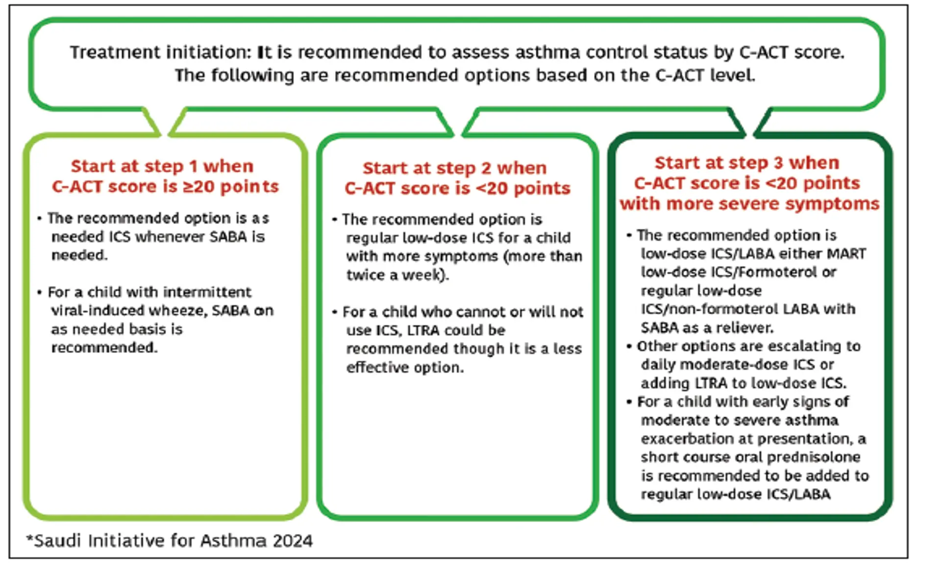 Treatment Initiation: It is recommended to assess asthma control status by C-ACT score. The following are recommended options based on the C-ACT level.
