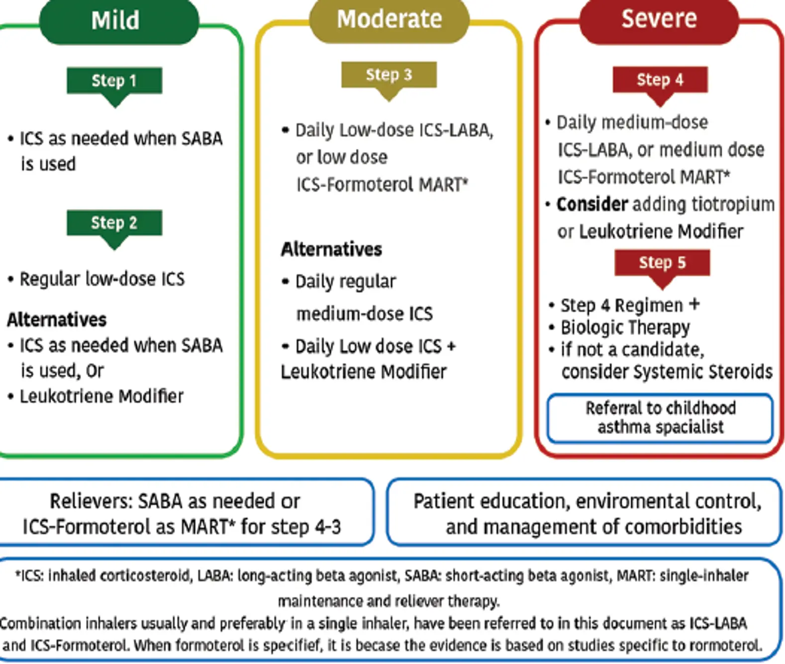 - The recommended option is low-dose ICS/LABA either MART low-dose ICS/Formoterol or regular low-dose ICS/non-formoterol LABA with SABA as a reliever.