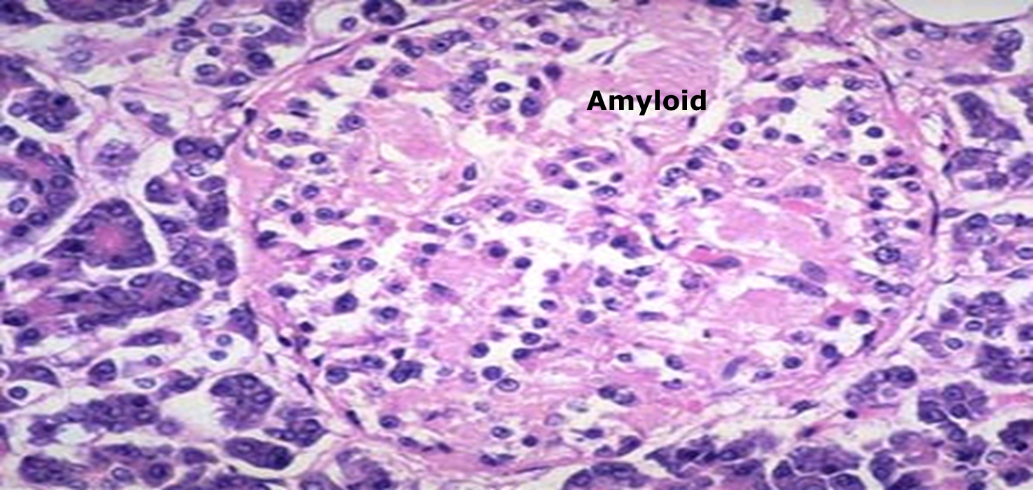 Pancreatic islets in type II DM - H &E stain(Islet shows extensive deposition of amyloid)