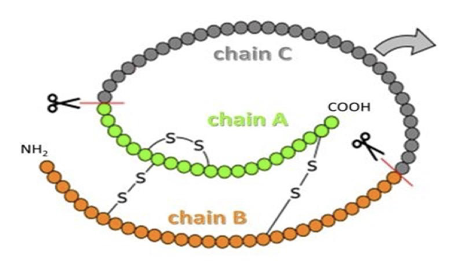In the stored form, the two chains connected by C- peptide