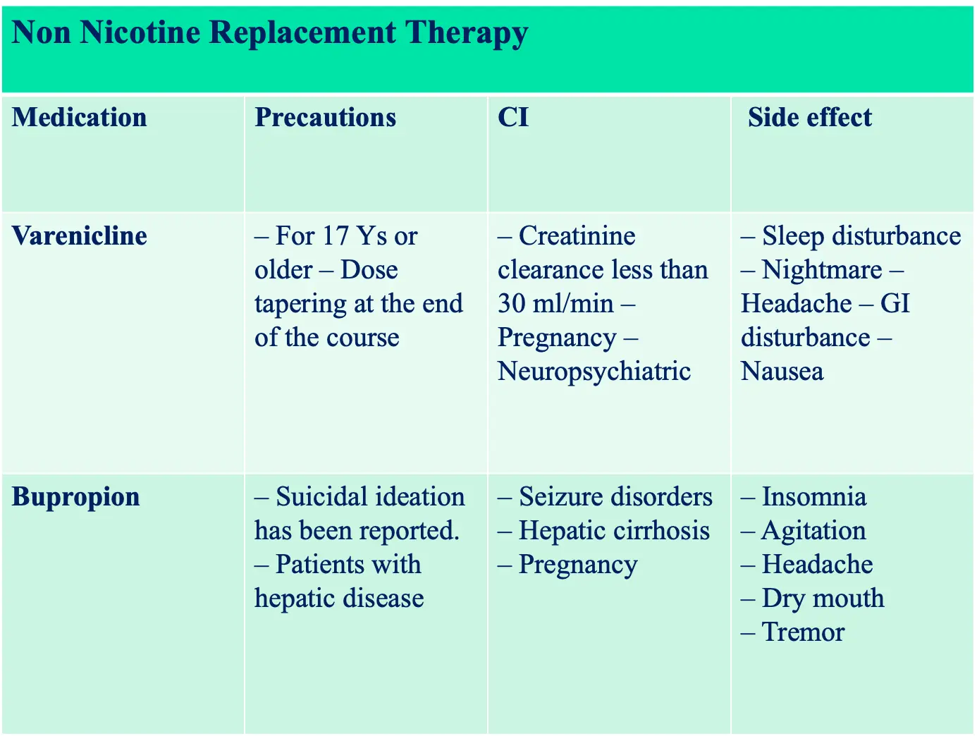 - Presumed to alleviate cravings associated with nicotine withdrawal affecting noradrenaline and dopamine