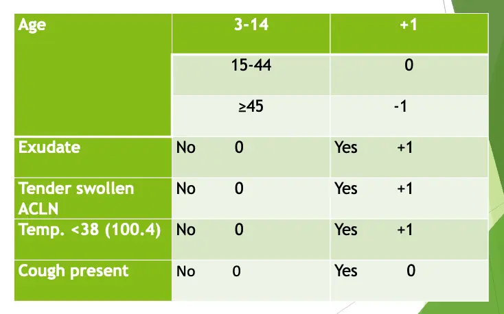 - The score should be used to assist the decision on whether to prescribe an antibiotic, but cannot be relied upon for a precise diagnosis.