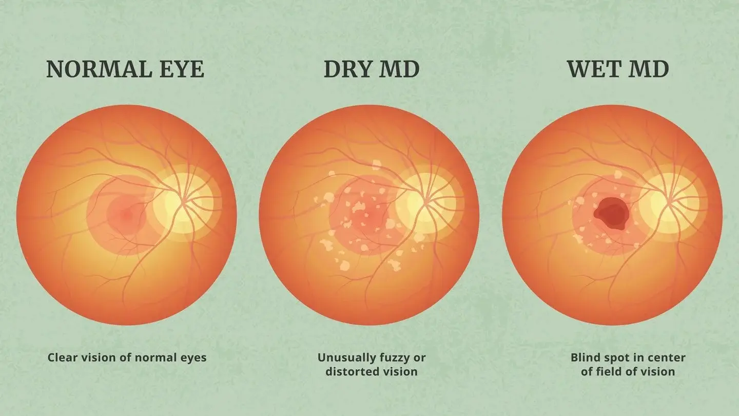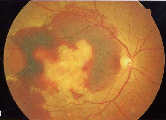 - Wet: gray-yellow CNV under retina of posterior pole, associated with dark red subretinal hemorrhage, which covers CNV sometimes