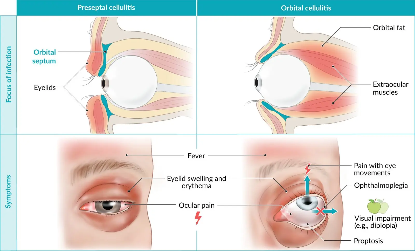 | Location | Infection of eyelid/anterior eyelid tissues, anterior to the orbital septum | Infection of orbital fat and ocular muscles, posterior to the septum |