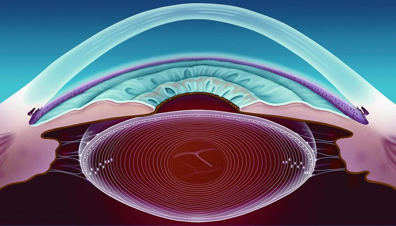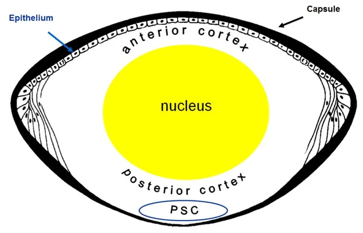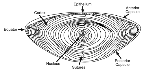 Anatomy Eye Components Lacrimal gland Lacrimal gland ducts Pupil Sclera Iris Lacrimal puncta Eyelid Superior lacrimal canal Lacrimal sac Inferior lacrimal canal Lacrimal duct Anatomy of the Eye The lens is biconvex and transparent. It is held in position behind the iris by the suspensory ligament whose zonular fibres are composed of the protein fibrillin which attach its equator to the ciliary body. Anatomy of the Lens Location Posterior to iris Anterior to vitreous Shape: Biconvex Structure Lens capsule Lens cortex Lens nucleus Lens Anatomy Details Equator Anterior capsule Posterior capsule Diameter: 9-10mm Thickness: 4-5mm Lens zonule Lens Substance Lens fiber Nucleus Cortex Function Refraction Accommodation Protection: UV filtration