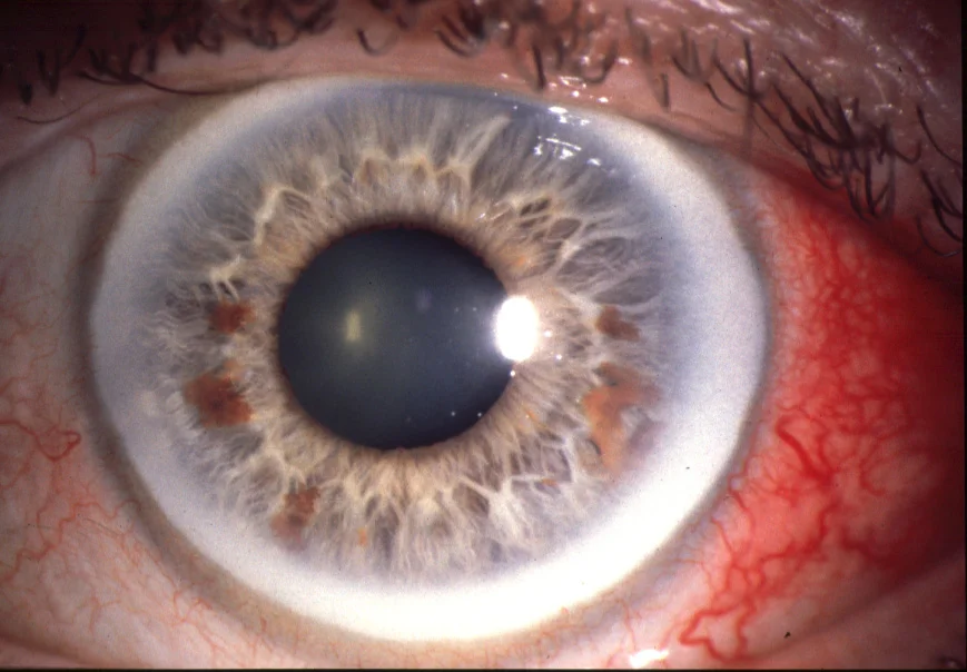 - Arc shaped opacity in the upper ½ or cornea then lower ½