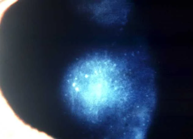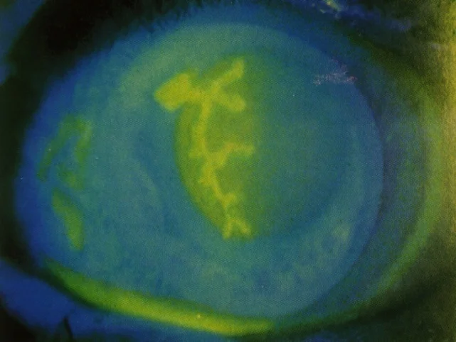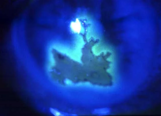 - B) (Characters of Dendretic Herpetic Corneal Ulcer) - Dendritic appearance - Long course with tendency to Recurrence - Hypothesia - (decrease corneal sensation)