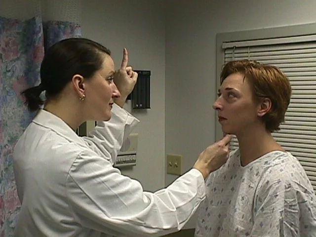 Ask pt to focus on your finger held approx 12” away from his/her nose