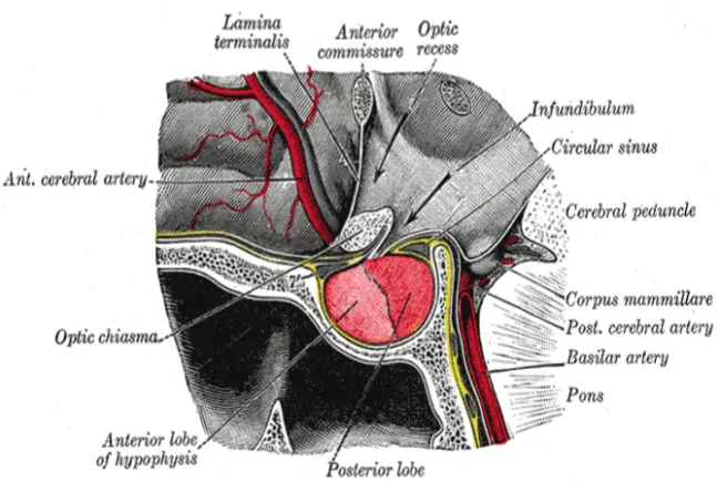| Hypothalamus | Suprasellar tumours | Optic atrophy, Papilloedema |