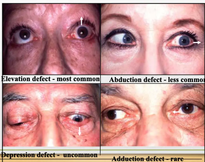 - Elevation defect - most common - IR - first muscle effected (restrictive myopathy fibrosis)