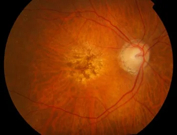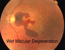 - Wet: gray-yellow CNV (Choroidal Neovascularization) under retina of posterior pole, associated with dark red subretinal hemorrhage, which covers CNV sometimes