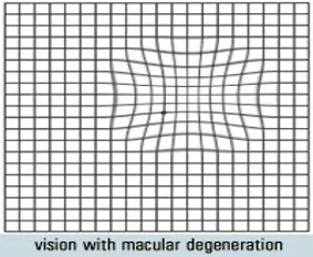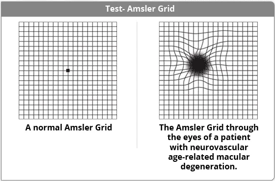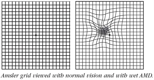 The Amsler Grid through the eyes of a patient with neurovascular age-related macular degeneration.