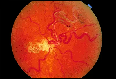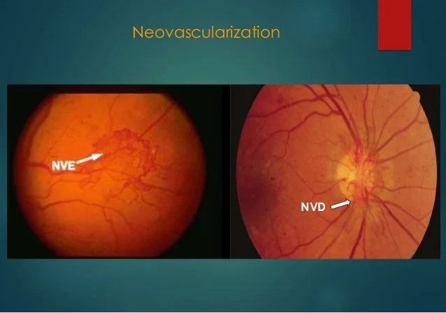 Neovessels, NV A large area of retinal ischemia → formation of vascular endothelial growth factor → neovascularization