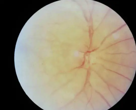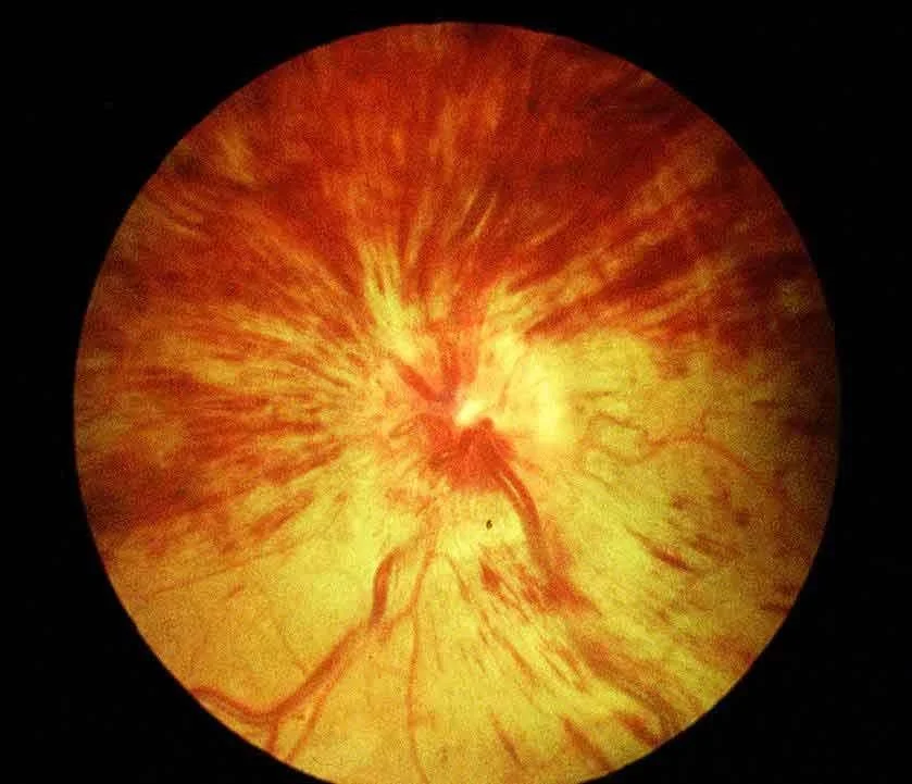 - Ophthalmoscopes picture of disc swelling, venous engorgement, cotton wool spots, and diffuse retinal hemorrhages like blood and thunder.