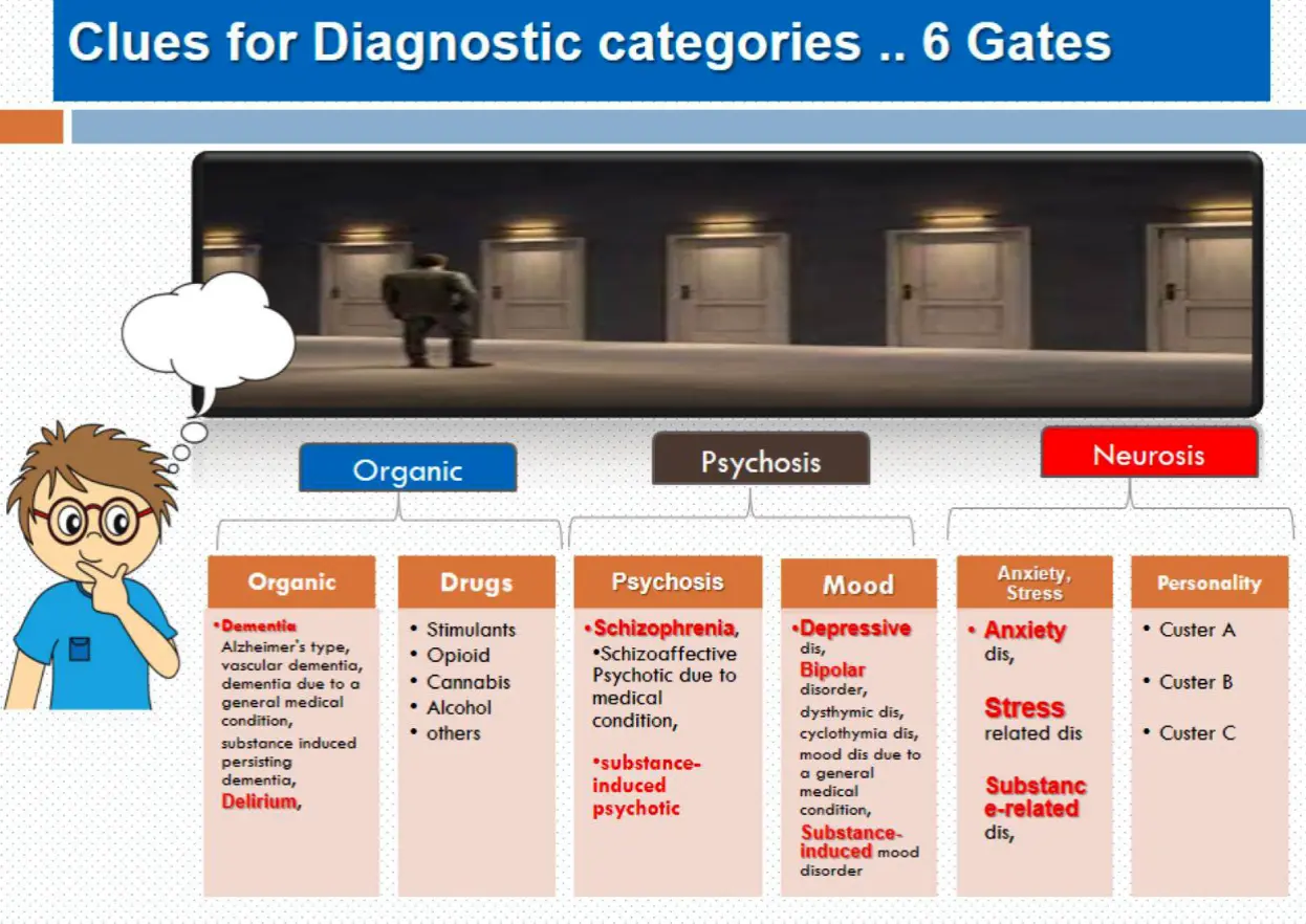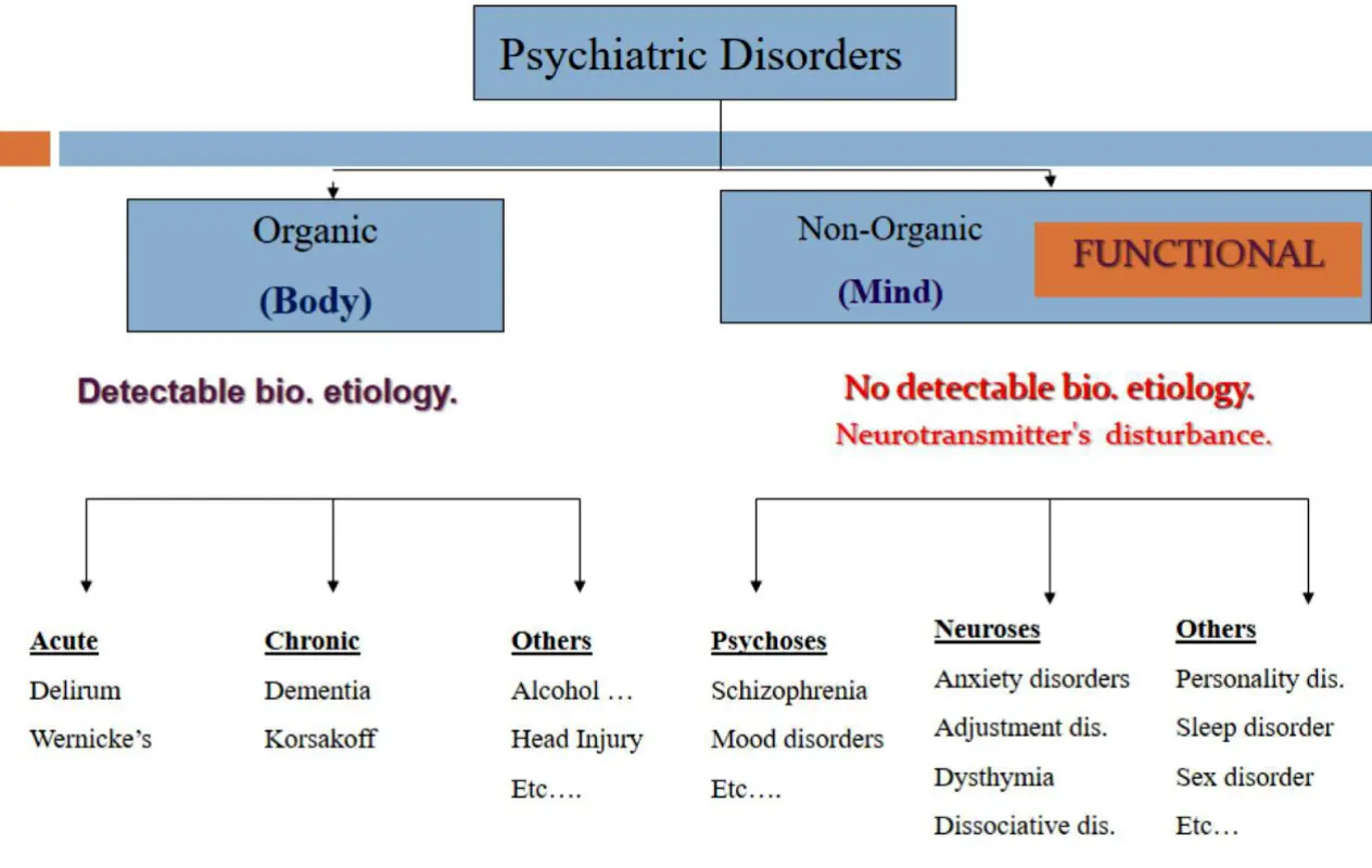 - Organic mental disorders then functional psychotic disorders (e.g. Schizophrenia) then neurotic disorder (e.g. generalized anxiety disorder) then personality disorders.