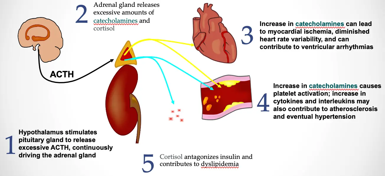 - Increase in catecholamines causes platelet activation; increase in cytokines and interleukins may also contribute to atherosclerosis and eventual hypertension