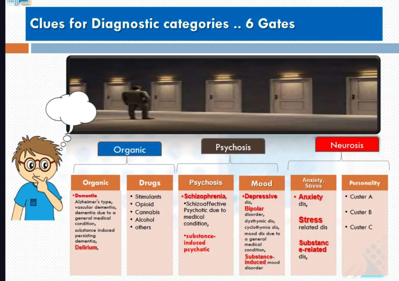 - Alzheimer’s type, vascular dementia, dementia due to a general medical condition, substance induced persisting dementia, Delirium.