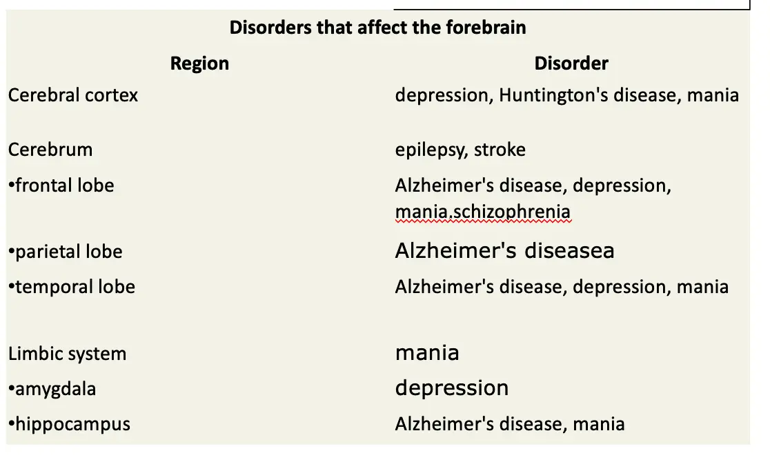- Disorder: Alzheimer’s disease, depression, mania, schizophrenia