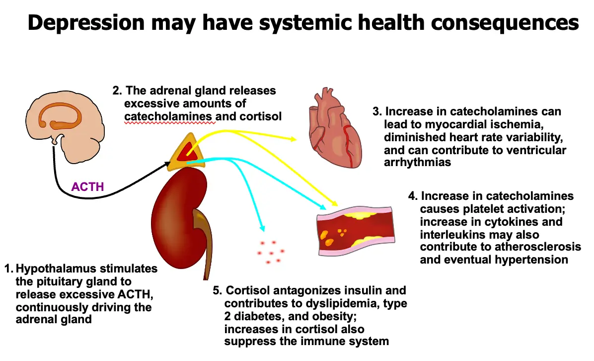 MDD may not only be a “psychiatric disease,” as there is evidence of widespread systemic consequences. Neuroendocrine dysregulation and elevated sympathetic tone may result in cardiovascular morbidity and increased risk of metabolic syndrome. Immune response may be compromised in MDD. Major depression and depressive symptoms, although commonly encountered in medical populations, are frequently underdiagnosed and undertreated in patients with cardiovascular disease (CVD). This is of particular importance because several studies have shown depression and its associated symptoms to be a major risk factor for both the development of CVD and death after an index myocardial infarction. Treatment of depression in patients with CVD may be able to improve their dysphoria and other signs and symptoms of depression and improve quality of life.